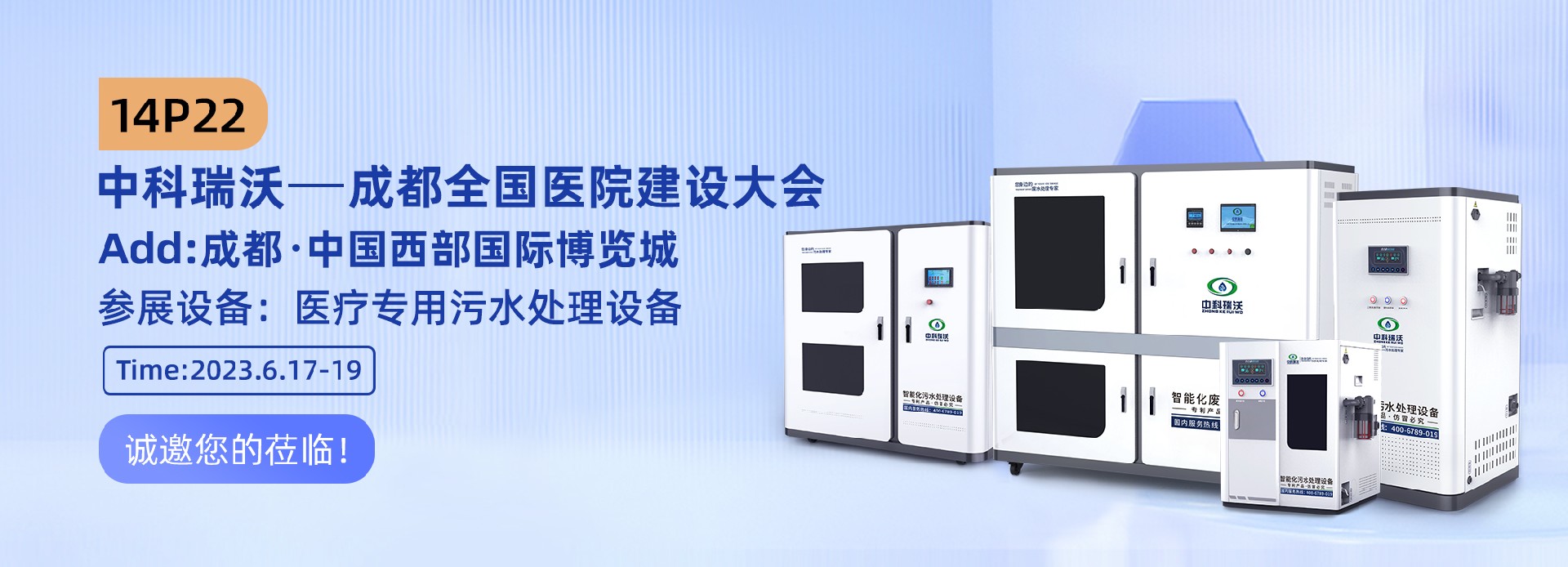 歡迎大家蒞臨中科瑞沃14P22,屆時我們會有專業(yè)的技術和業(yè)務人員,為您提供專業(yè)及時的解答和指導,不論您是針對設備的使用,或者對于污水危害的關注,再或者是對于醫(yī)療污水處理的疑問,您都可以找到我們,我們一定會提供專業(yè)領域靠譜的解答,熱情禮貌的招待,互利共贏的合作。
